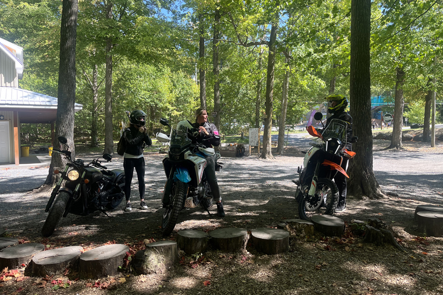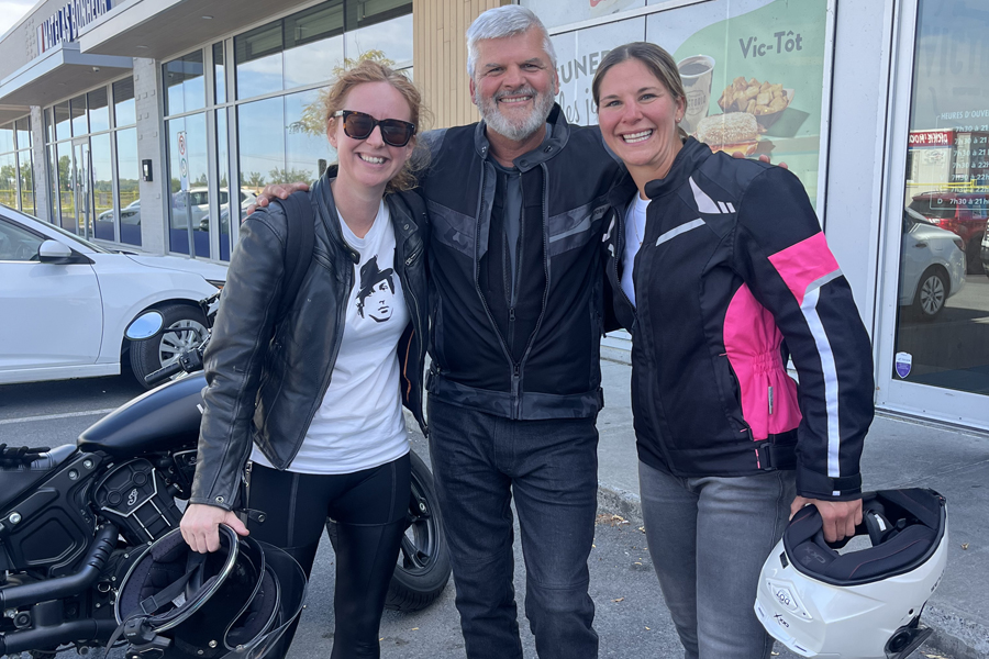 Silvi Tourigny, Marie-Ève Dicaire et Jean Paré. Indian Scout Bobby Sixty 2021, CFMOTO IBEX 450 2025 et KTM 390 Adventure R 2025.